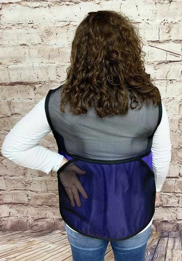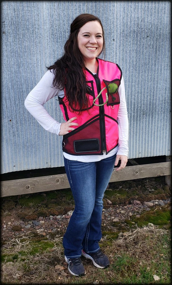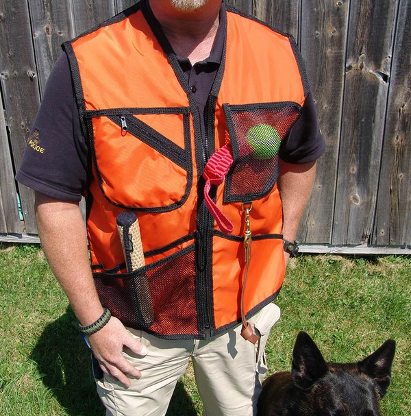 The Handler Training Vest that is made in the USA and is of the highest standard of workmanship. There is not a raw seam on this vest. All seams are double stitched and bound for durability and comfort. The neck is a comfortable open V style. The back top of this vest is made of strong mesh for ventilation in warm weather training. The back large pouch pocket is also made of a layer of mesh that is lined for stability. On the side there is a D-ring to hook your leash when not in use and another D-ring on the top front under the ball pocket. The front has three large bottom pockets, one being mesh. On the top there is a pocket that opens at the side for quick access of your motivation ball or tug. The other front top pocket zips closed so you can keep items secure. The zipper is molded so no rusting. The arm holes are large enough to be comfortable. USA MADE
