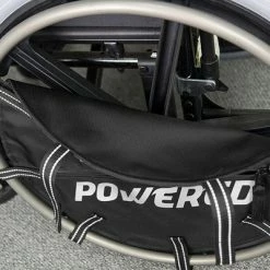 It is made from water resistant strong black ballistic materials. This material wipes clean with damp towel. It quickly and securely attaches to the wheelchair tire with eight reflective hook and loop straps. This bag has a center zipper with a large easily accessible long zipper tab. The text on the Wheelchair Spoke Guard Bag is done with reflective vinyl. This is a great safety feature for early morning and evening hours of travel.